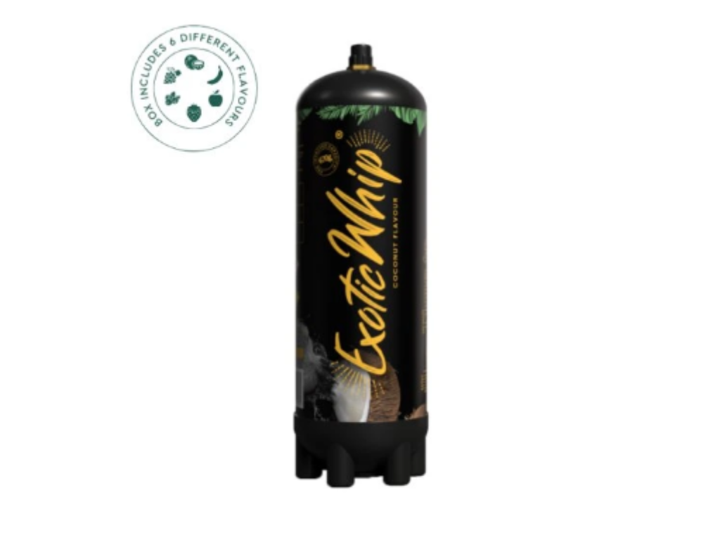 Exotic Whip - Kokos nabízí špičkově a designově zpracovanou nádobu na výrobu šlehačky, která obsahuje 670G gramů oxidu dusného (N₂O) zvaného rajský plyn.